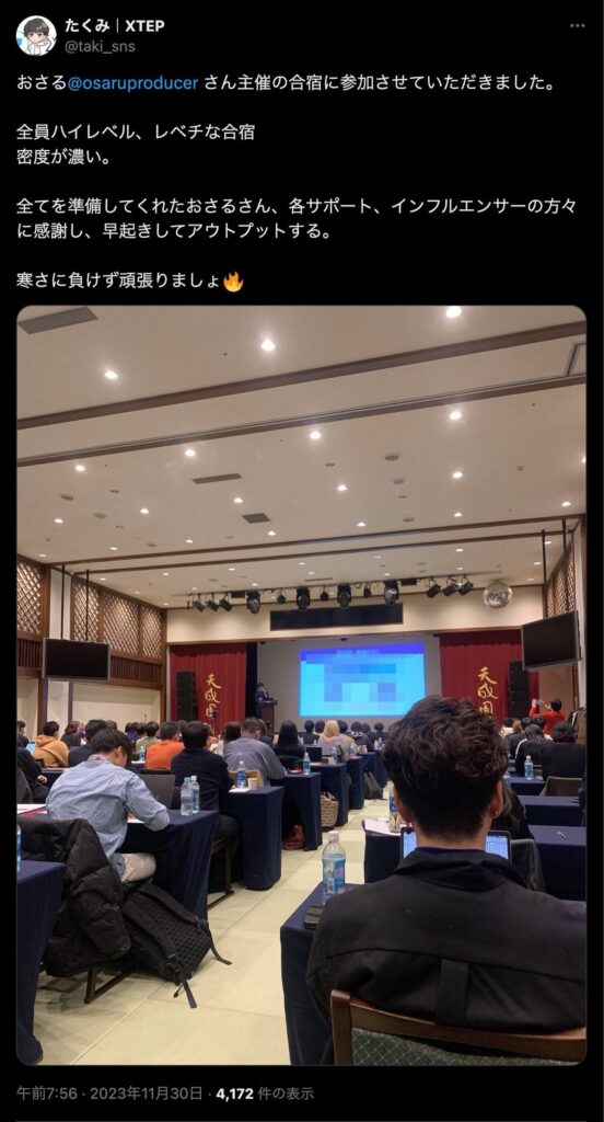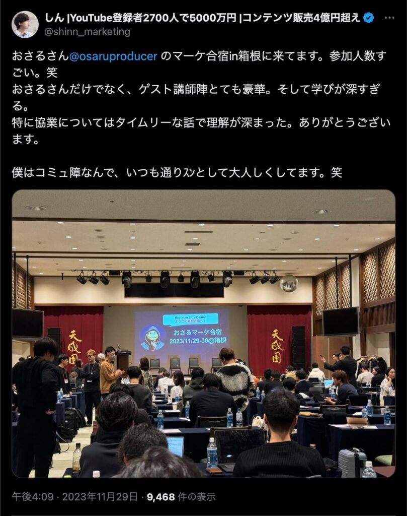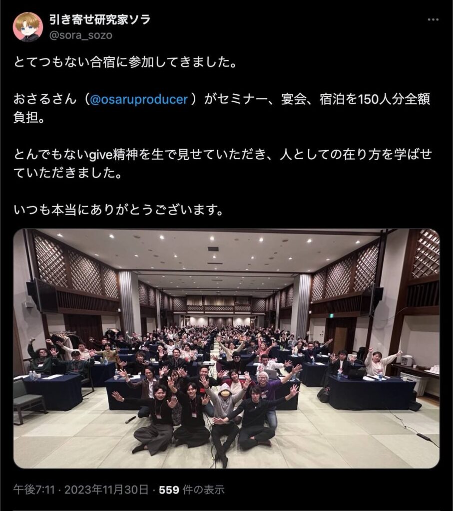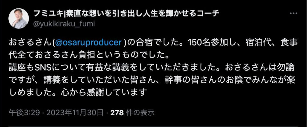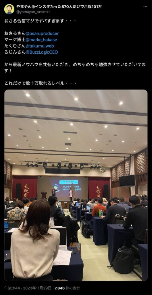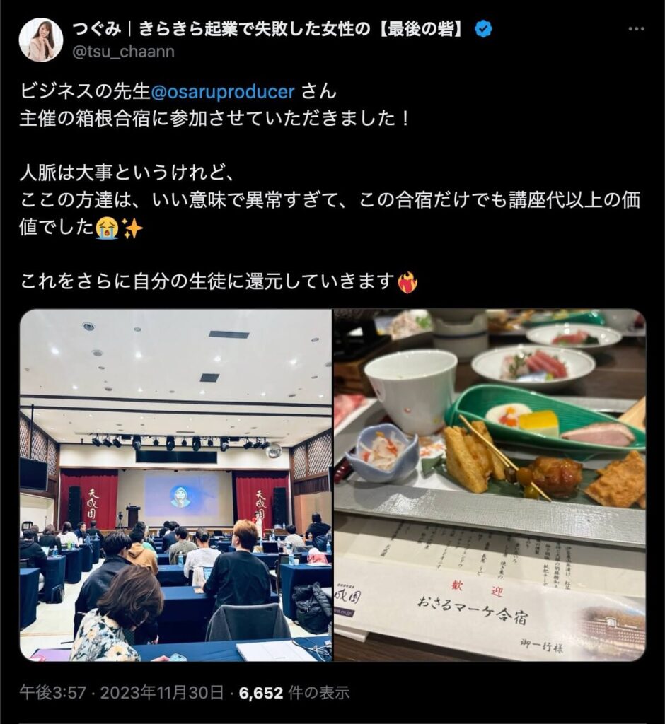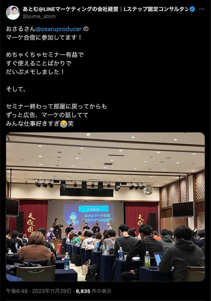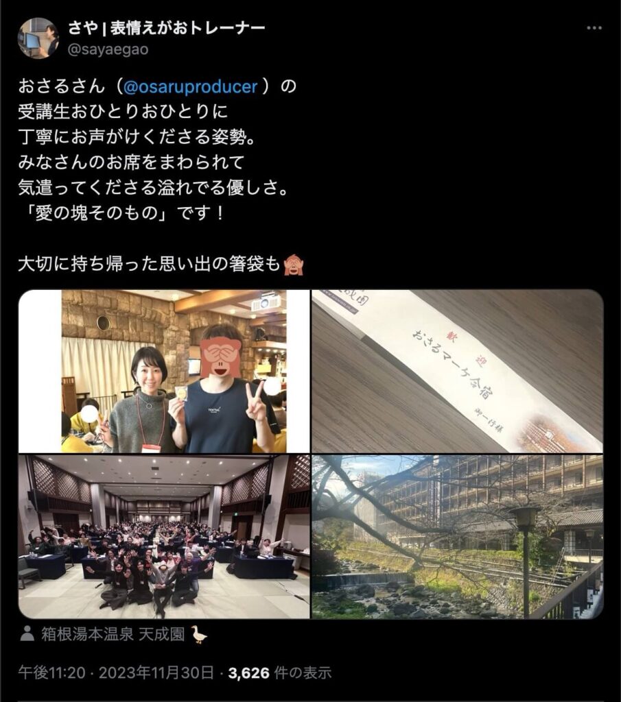 2023年11月29日、おさるマーケ講座のおさるマーケ合宿が開催されました。今回は総勢150名以上が参加する特大規模となりましたので、その様子を参加者の口コミとともにお伝えします。