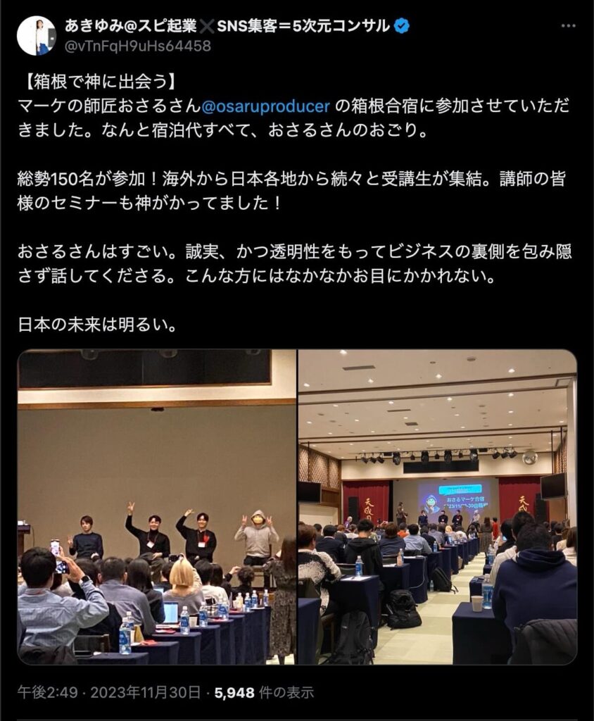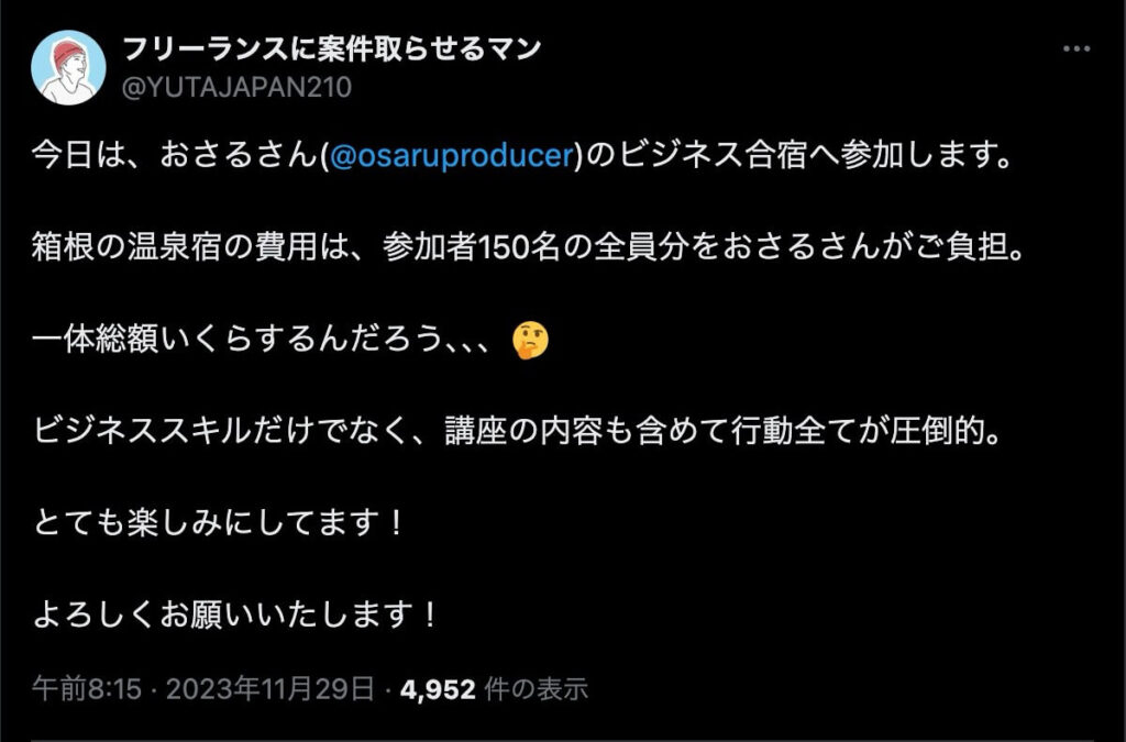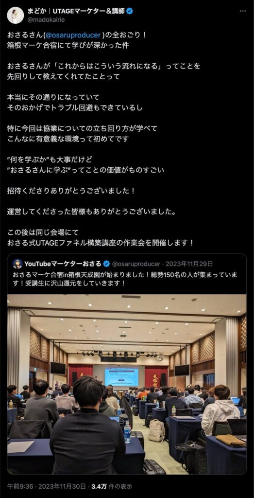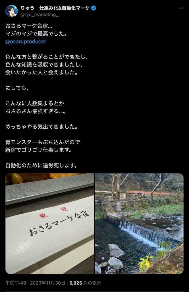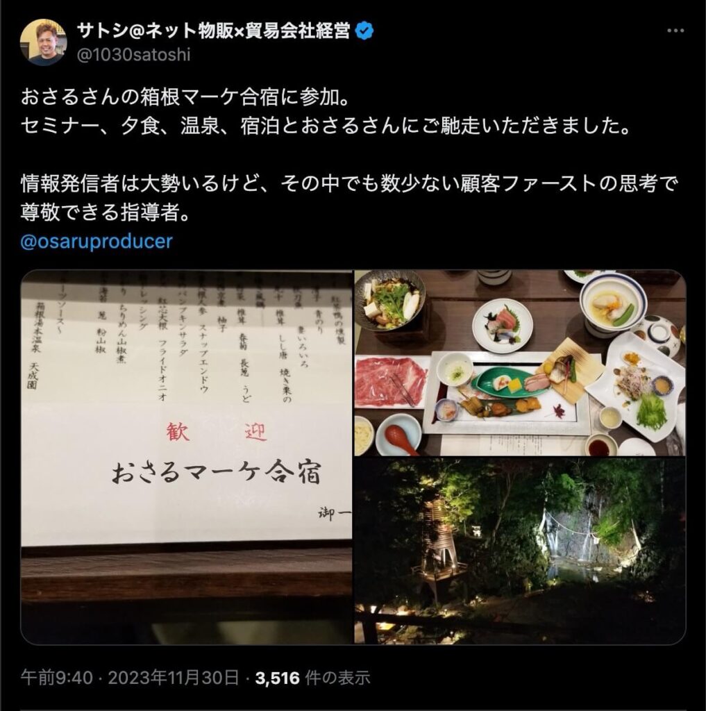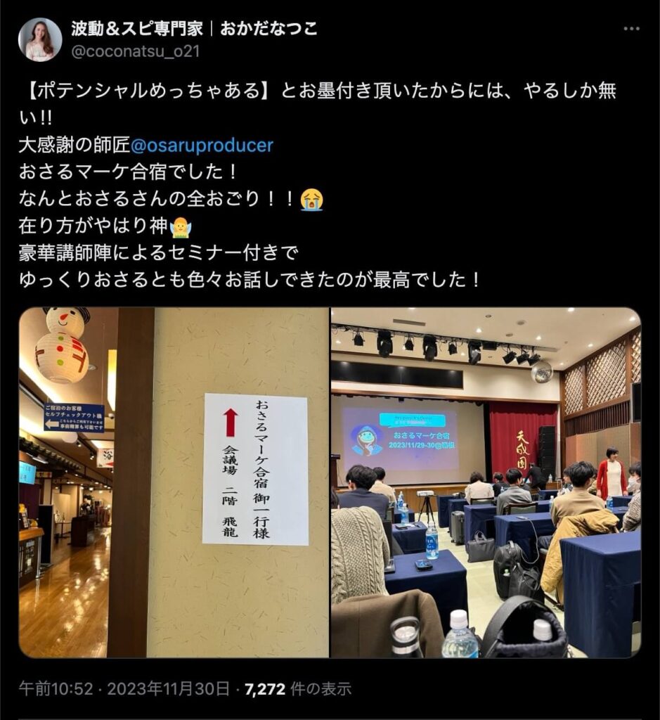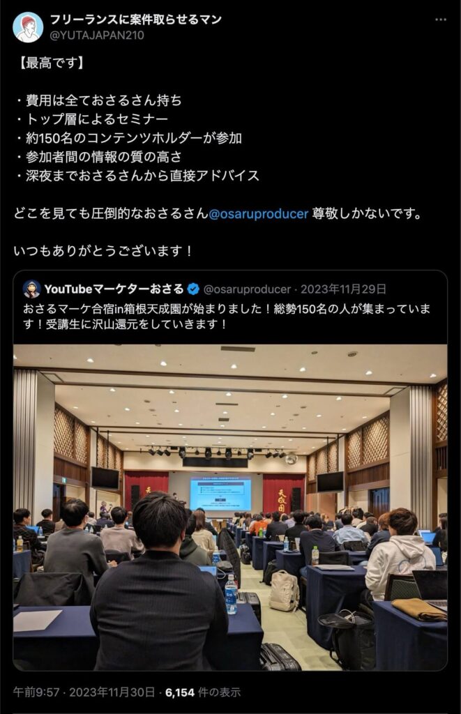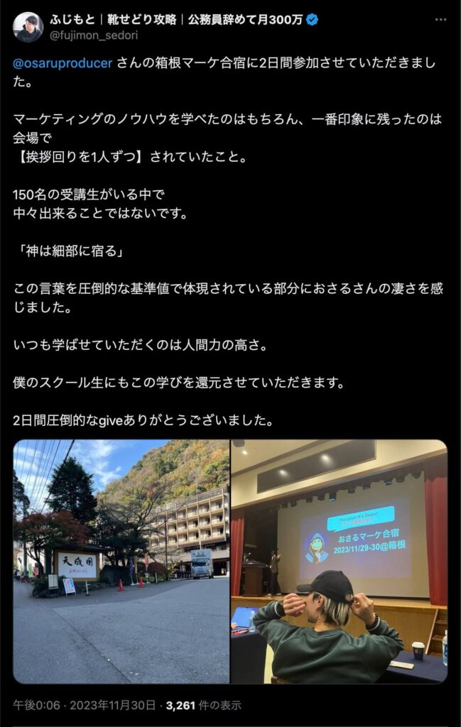 2023年11月29日、おさるマーケ講座のおさるマーケ合宿が開催されました。今回は総勢150名以上が参加する特大規模となりましたので、その様子を参加者の口コミとともにお伝えします。