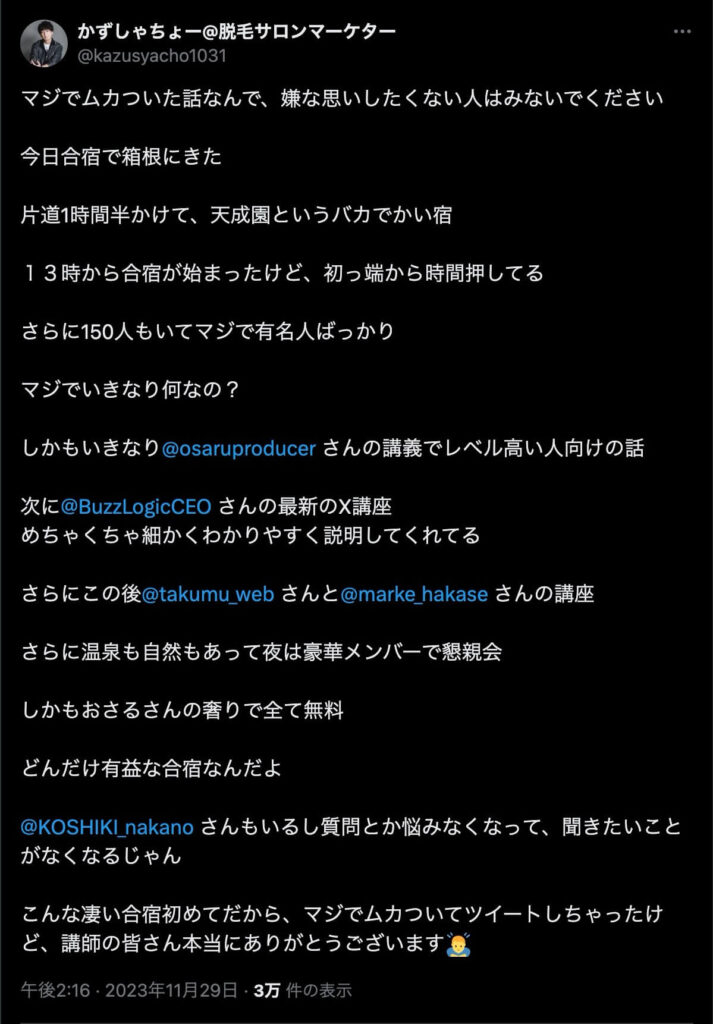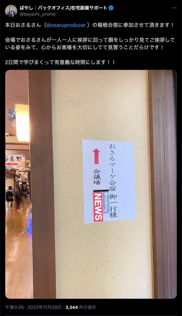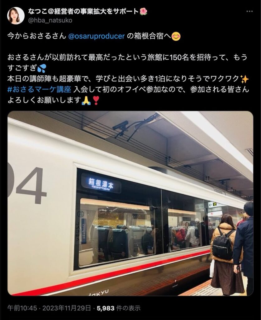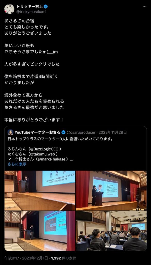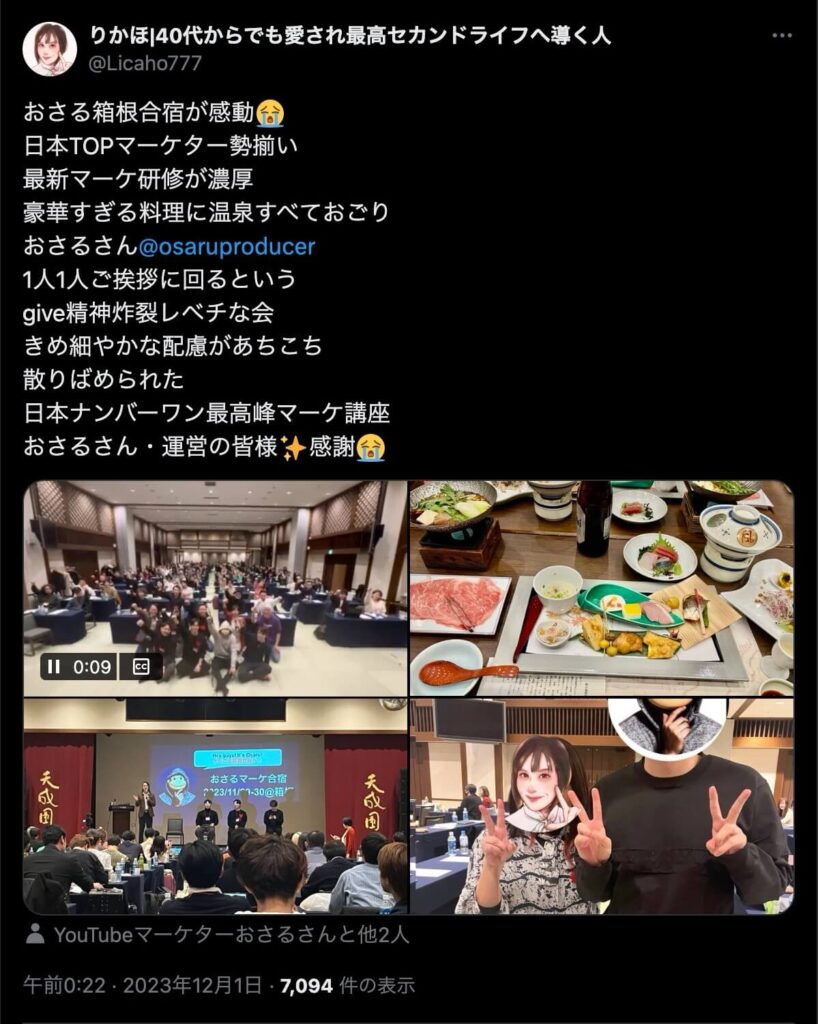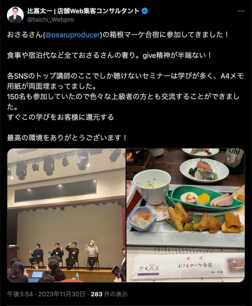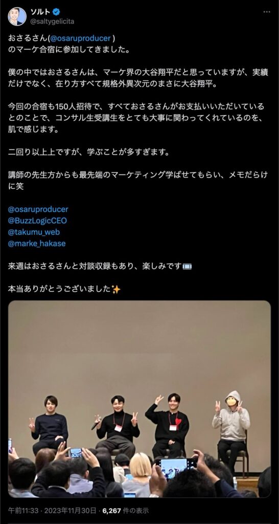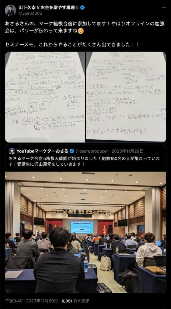 2023年11月29日、おさるマーケ講座のおさるマーケ合宿が開催されました。今回は総勢150名以上が参加する特大規模となりましたので、その様子を参加者の口コミとともにお伝えします。
