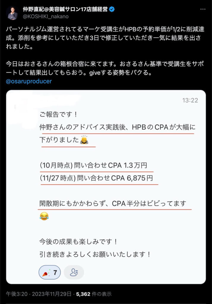 など、そのすべてがおさるの奢りですので、おさるの総合マーケ講座受講生は無料で参加することができます。そのため回数を増すごとに参加希望者が増え、抽選当選者のみが参加できる大人気企画です。