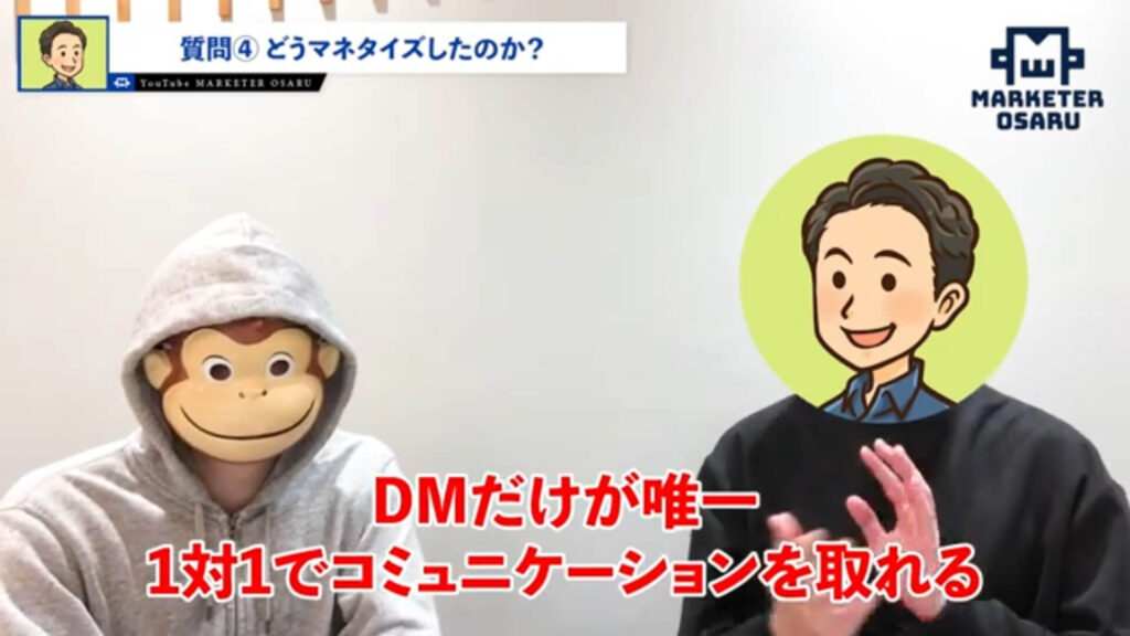 おさる:当たり前なんですけど、海外でも役に立つコンテンツを発信しなさいと最初に言われるんですね。だからマーケティングはすごく狭い世界のようなものと考えてしまって、テクニックみたいなハック思考になっちゃうんですけども。
