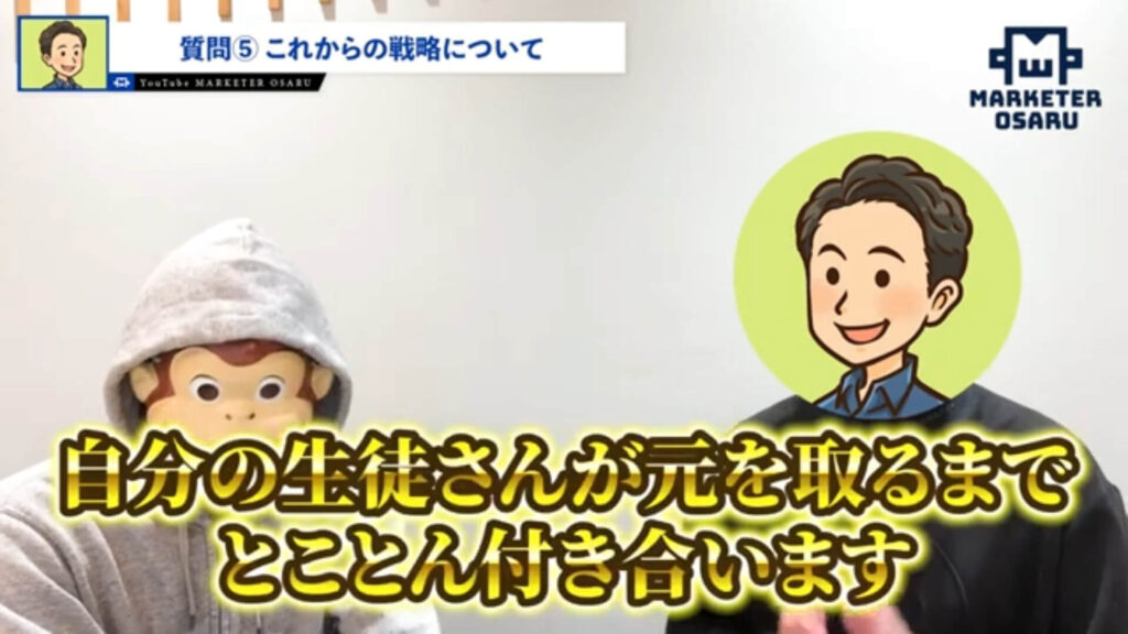 やまやん:これからの戦略として、まずはおさるさんのマインドをしっかり受け継いで、サポート代金をしっかり回収するのを保証するというのをやっていて。自分の生徒さんが元を取るまでとことん付き合いますというのをやっています。