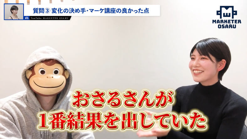おさる:質問の3つ目ですが、変化の決め手となったことを教えてください。