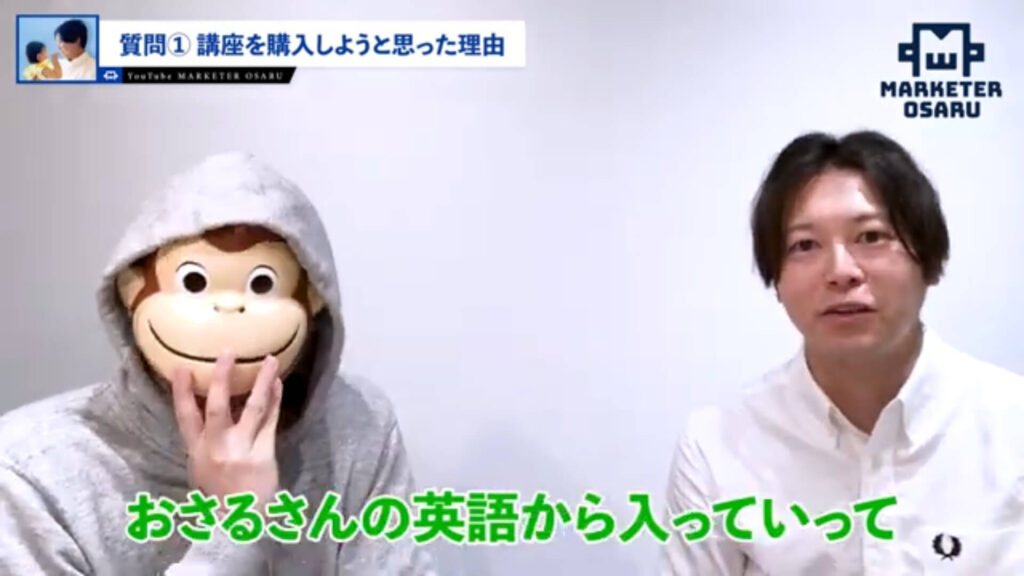 おさる:イングリッシュおさるというチャンネルを1人でやっているのですが、そちらを見て意外とマーケティングの講座を購入してくださる、ゆーろさんみたいな方が多いんですよ。けっこう驚きですよね。英語とマーケティングはまったく違うジャンルですが、ありがとうございます。