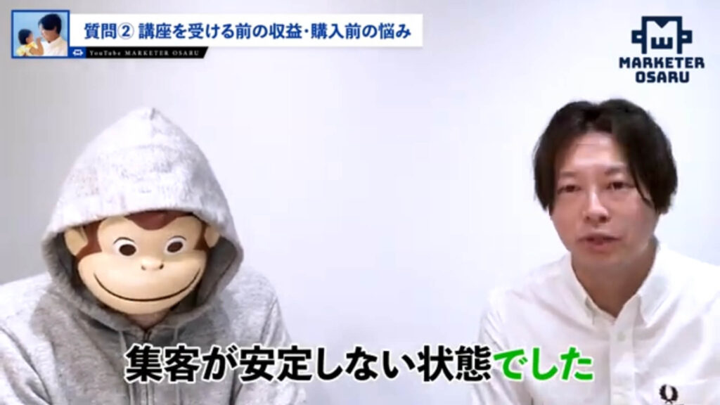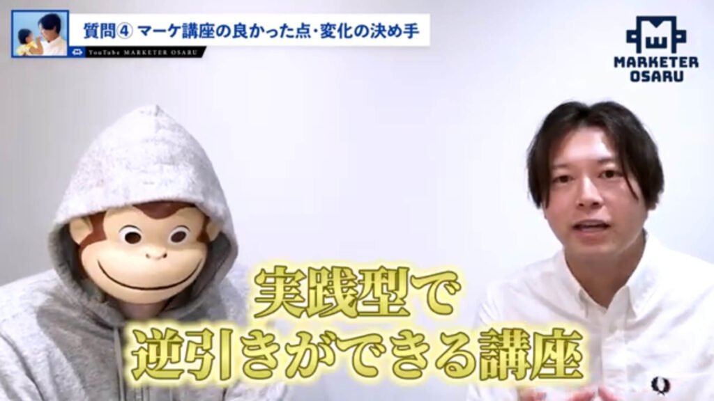 おさる:みなさんもやってみてください。YouTubeも学んだというのも1つだと思いますけど、実際にマーケティングの講座の良かったところなどを、ざっくばらんに聞きたいんですがいかがですか?