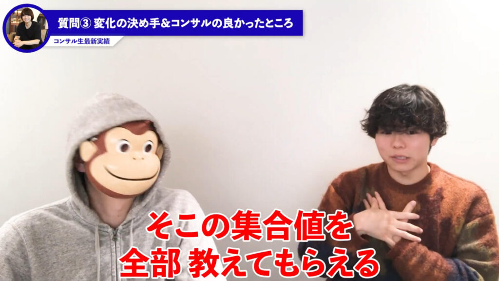 1年半さまざまなことを教わって改めてすごくいいなと思ったのは、0から実績のない人の結果を出しているのは強みなんですけど、そういう人たちの成功した知見が全部おさるさんに集まっているなというところです。そこがほかのコンサルの人にはない強みだなと思っています。