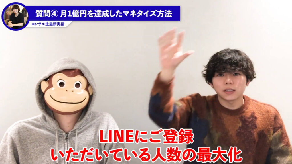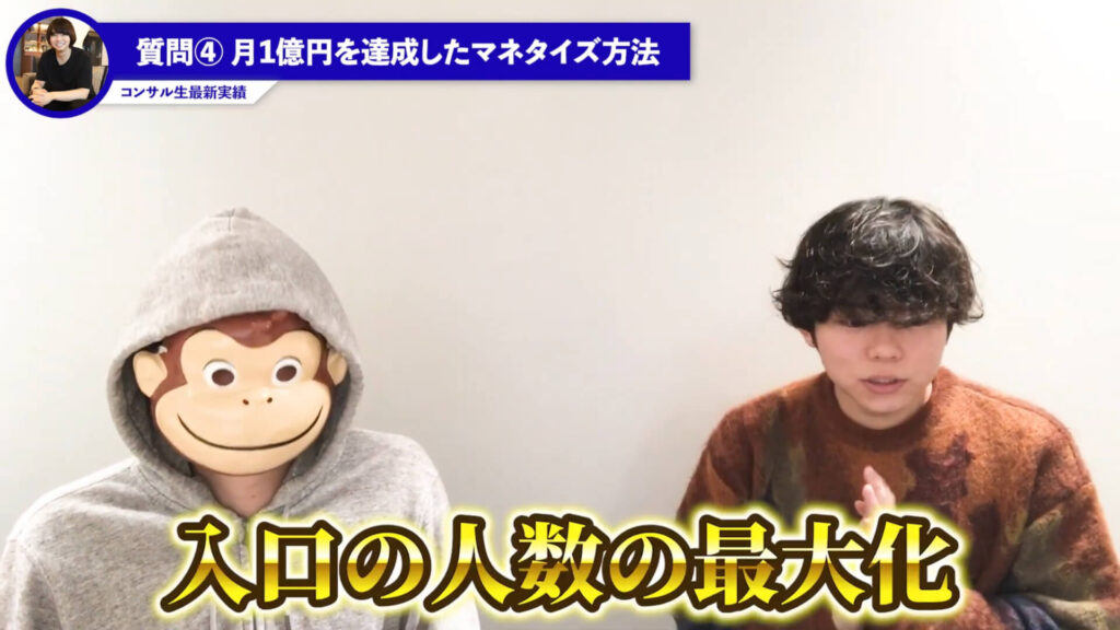 おさる:どうマネタイズしてきたのかというところで、ここが皆さん気になると思います。月3,000万円の方法はほかの動画でお話ししているんですけども、月3,000万円から月1億円に達した方法を教えてください。