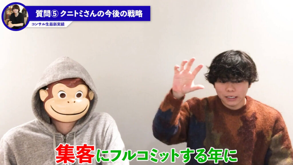 クニトミ:手取り足取りおさるさんから教わって1年半かかったので、独学だったら3~4年かかっていたのではないかと思います。1年半やってきて、それを踏まえた上で次どういうフェーズかというと、ある程度落ち着いたので2023年は集客だけの年にしたくて。