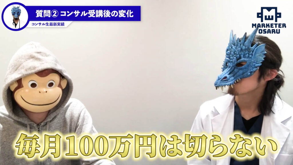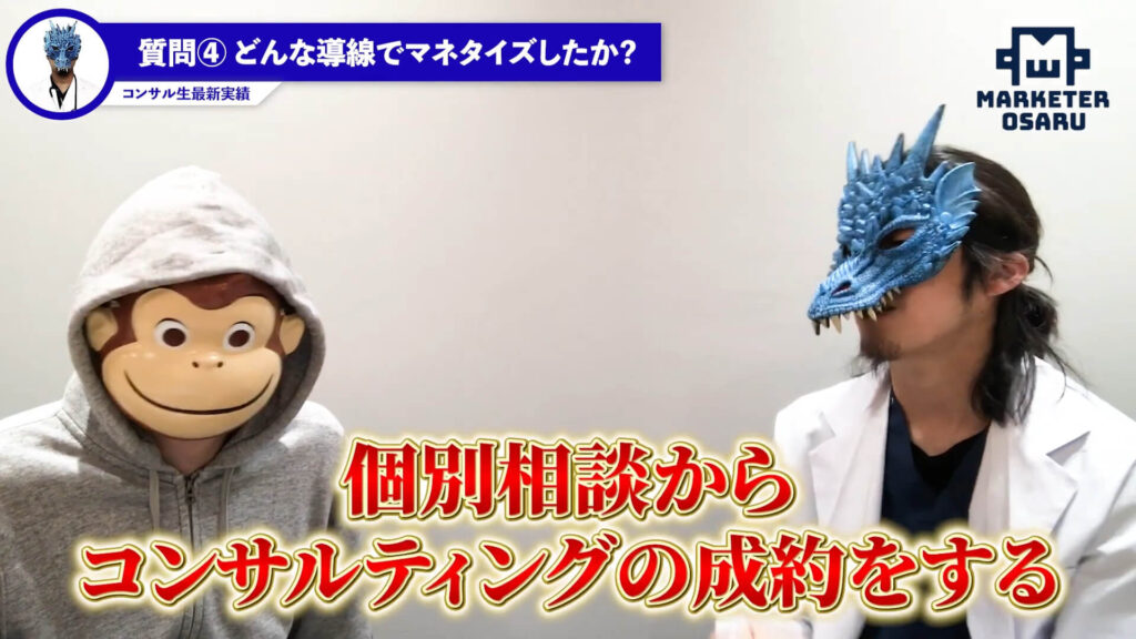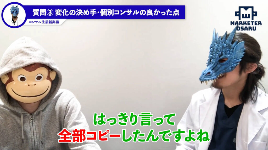 おさる:開始5か月で登録者が50人くらいしかいなくてそこからスタートして月額で大体100万とか150万売り上げました。そこで質問3つ目なんですけどその変化の決めてとなったもの、僕の実際のコンサルの部分でどこが良かったというかどこの部分を参考にして実際にできたかというところでいかがですか。