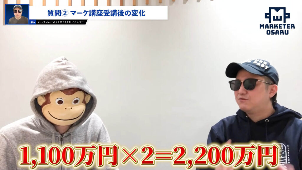 ホース:結論から言いますと、おさるさんの講座を受けた後、最高月収が1,100万円。それも単発でなくて、2回ローンチをしていますので、1,100万円 × 2 = 2,200万円。これをマネタイズできた。