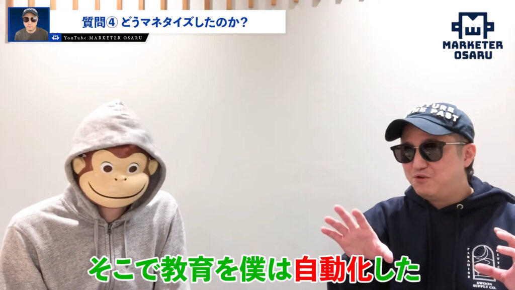 特に「おさる式マーケティング」と言って、どうやってリストをとってそこに販売をしていくかというものだったりとか、YouTubeも見よう見まねでおさるさんのYouTubeを見ながら自分で耳コピしながらやっていたものをすべて用意してくれている。