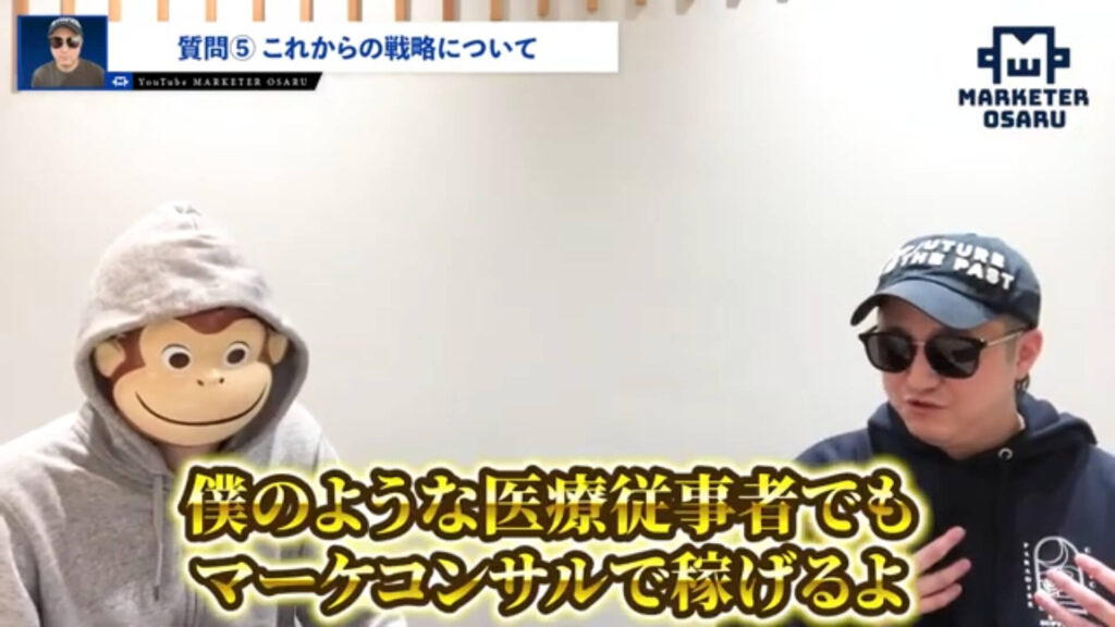 おさる:本当におっしゃる通りですね。何もスキルがありませんという人はコンテンツ販売よりもまずは例えば、物販とか、ブログとか0→1を作るというのがあります。けれども、医療従事者の方は、もう0→1を達成していますから。スキルがあるから。そこの部分で稼いで行ける。