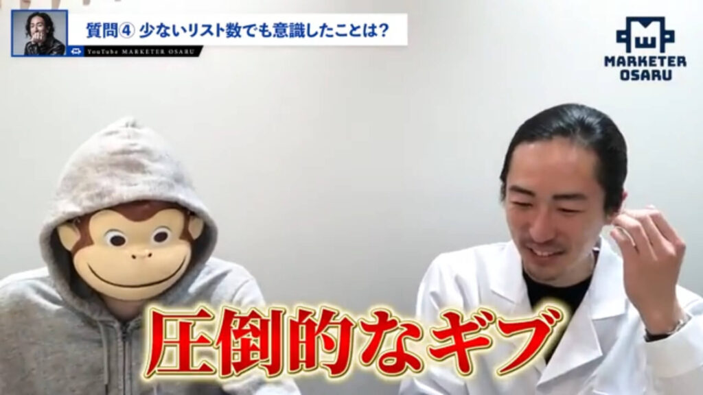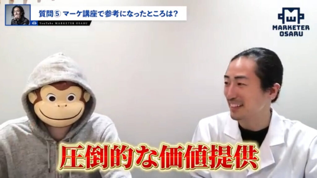 おさる:変化の決め手となったもの、僕のマーケティングの講座の何が良かったのかというと、圧倒的な価値提供をしたという。有料級のものをしっかりと発信していたということですかね?