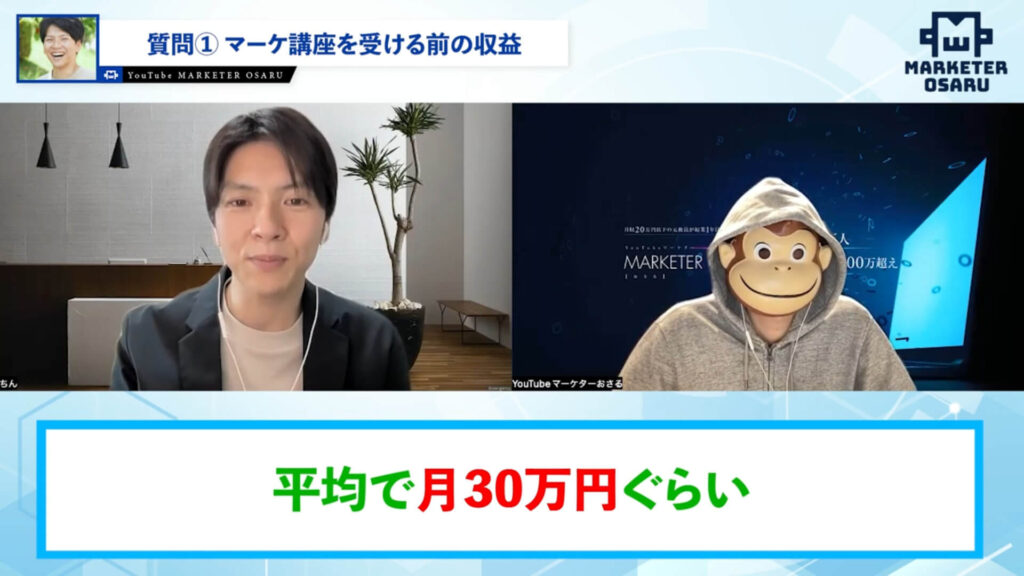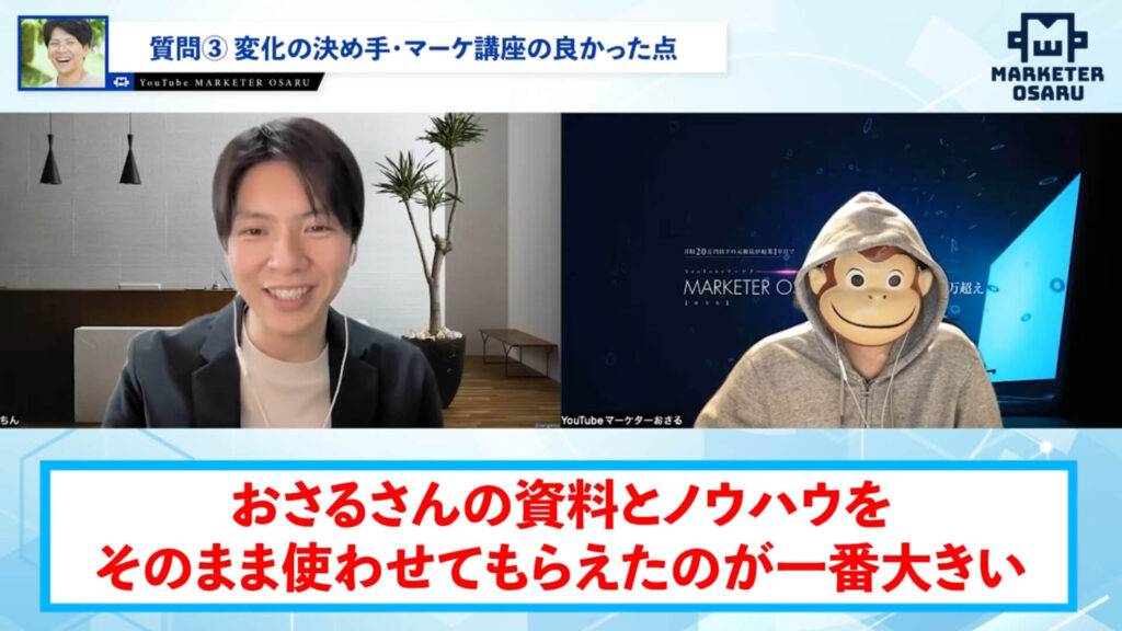 おさる:マーケティングでどうやって販売していくのかという。今回習ったところを教える側にもなれる。自分の売上もそうだけども、そちらで教えられるという。もう1個の事業が作れちゃう。そう考えると、僕の講座ってコスパが良いですよね。
