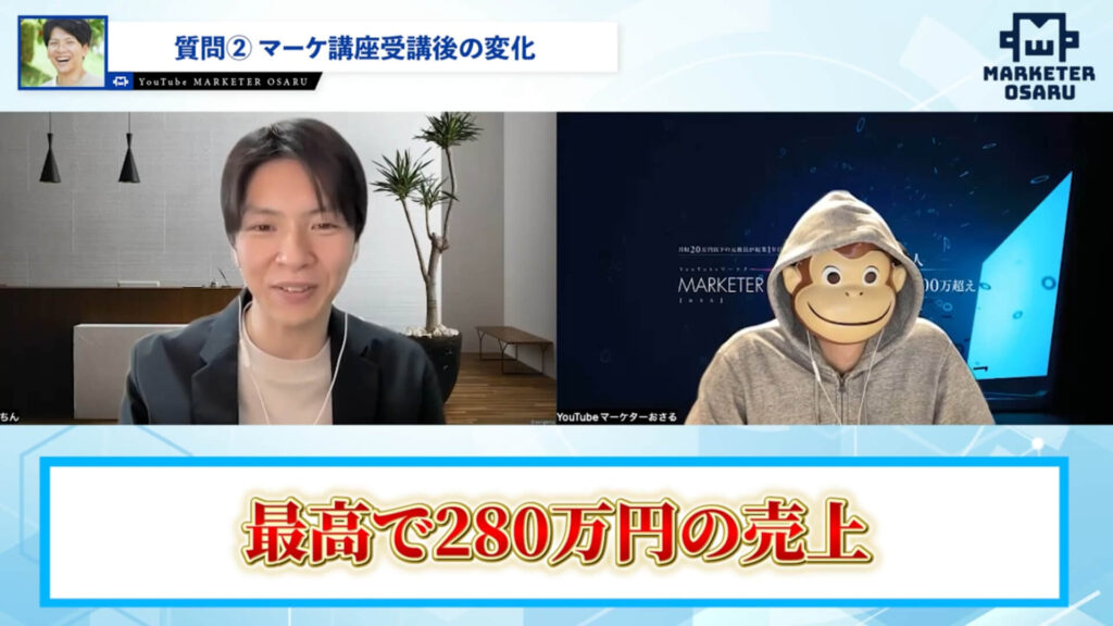 おさる:質問3つ目です。最高でも50万円、平均で30万円というところで、今回280万円、平均で90万円までいかれたと。その決め手となったもの、僕のマーケティング講座の何が良かったのかを教えていただけると幸いです。