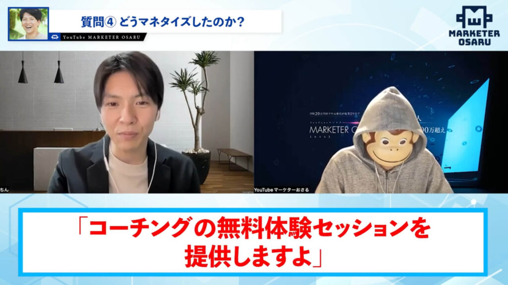 おさる:そこで値段も少し高めにしていただいて、ちんさんも単発だけで終わるんじゃなくて継続的に指導するという、お客さんの悩みをより解決するサービスを作成したということですね。
