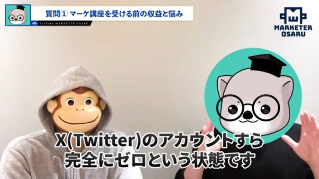 おさる:早速、質問1つ目です。講座を受ける前の収益ってこれは当たり前に0円なんですけれども、このあたりの収益と悩みを軽くいただければと思います。