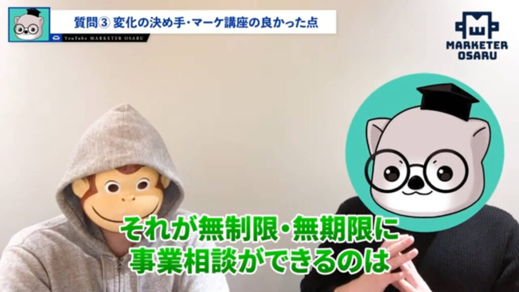 あと2つ目は、これは皆さんマーケティングの講座だと勘違いしている人が多いと思うんですけれども、実際は事業の顧問みたいな感じです。おさるさんは期待値調整のためにあえてそんなに訴求していないと思うんですけれども、これが実際本当に一番すばらしいです。