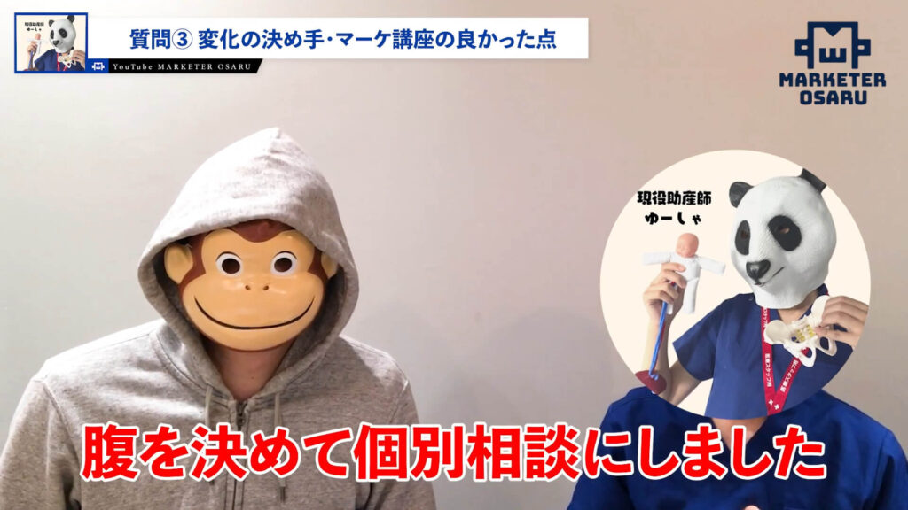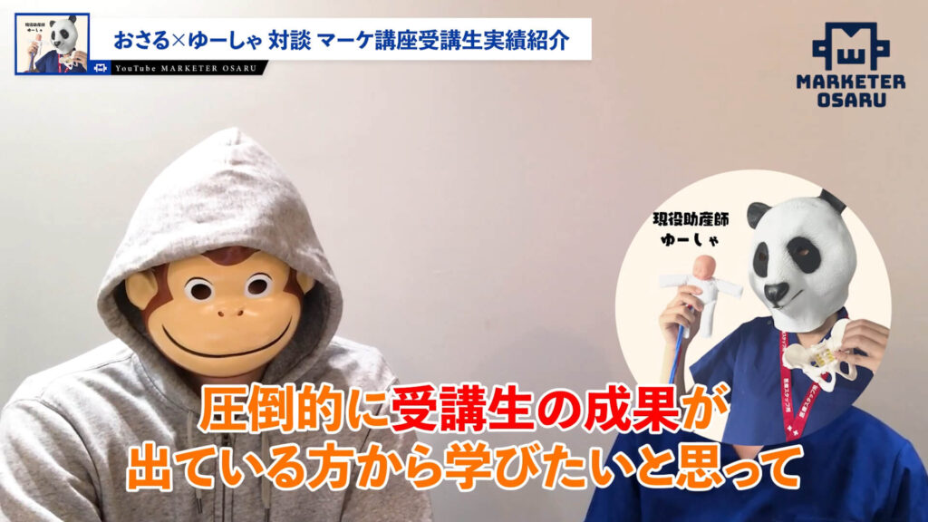 ゆーしゃ:YouTubeが売上を最大化することはずっとわかっていたのですが、自分ではなかなか踏み出せなくて。でもおさるさんの講座ならそこまで体系化がされていると思って、将来的な展開も含めて「今やるしかない」と決めました。