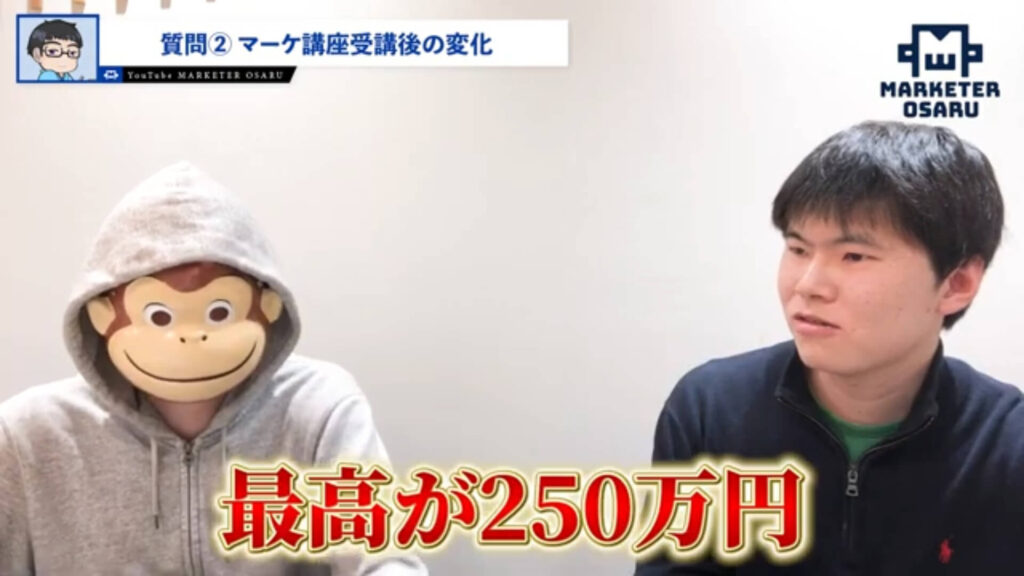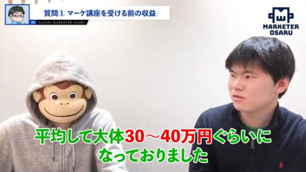 おさる:早速ですが質問の1個目にいこうと思うんですけど僕のマーケティング講座を受ける前はどれくらいの収益だったのか教えていただけますでしょうか。