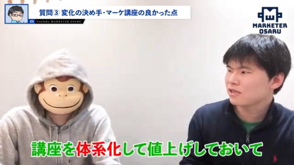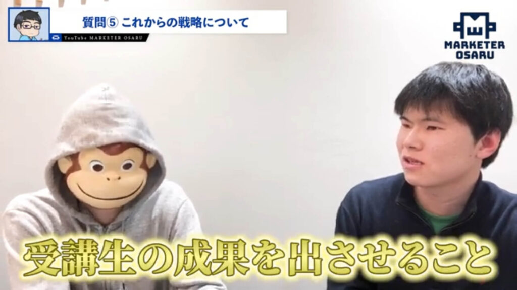 おさる:素晴らしいですね。いわゆるセット売りで相場をなくして例えば今までは数千円で売っていたけれどもまとめて付加価値をつけてお客さんが買ったら全部学べるようにしたということですね。