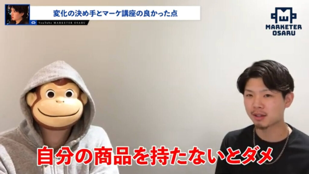 おさる:僕の講座に入ってから、その新たな講座を作成していただきました。僕の講座に入る前は商品がまったくない状態だったのですが、ちゃんと自社商品を作って今回に至るということですね。なぜ僕の講座を購入しようと思ったのか、このあたりはいかがですか?