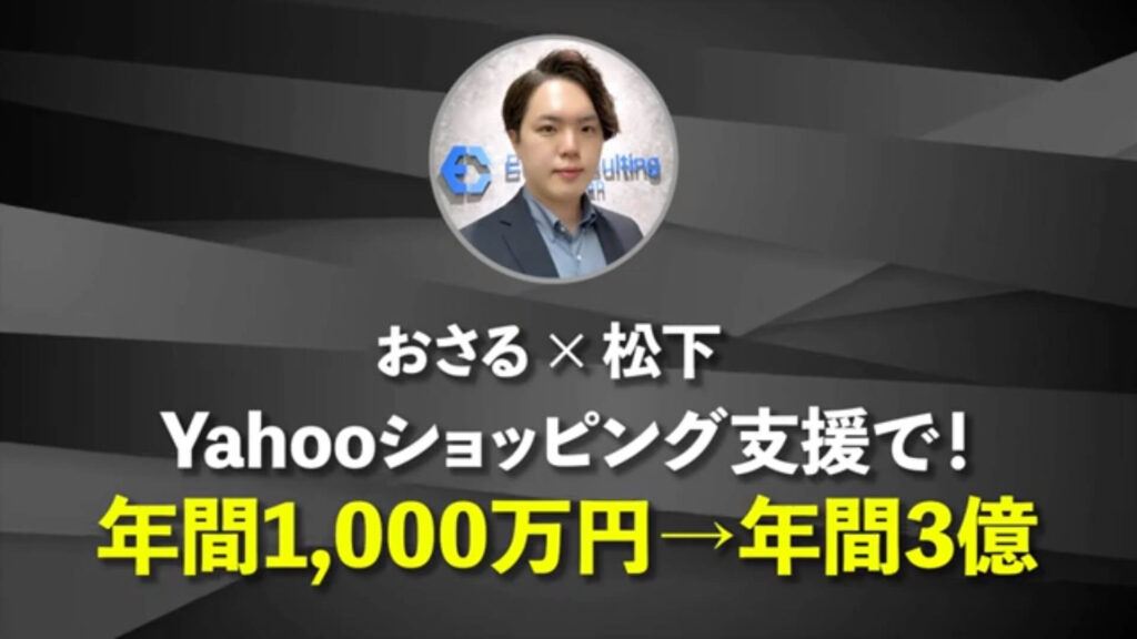 その実績がどれぐらいかというと、Yahoo!ショッピングの支援事業で、もともと最高月60万円・年間1,000万円の売上だったんですが、平均月2,000万円・最高5,400万円という意味がわからない数字を叩き出しました。年間1,000万円から3億円の事業にできたということですね。松下さんの自己紹介をしていただけますでしょうか。