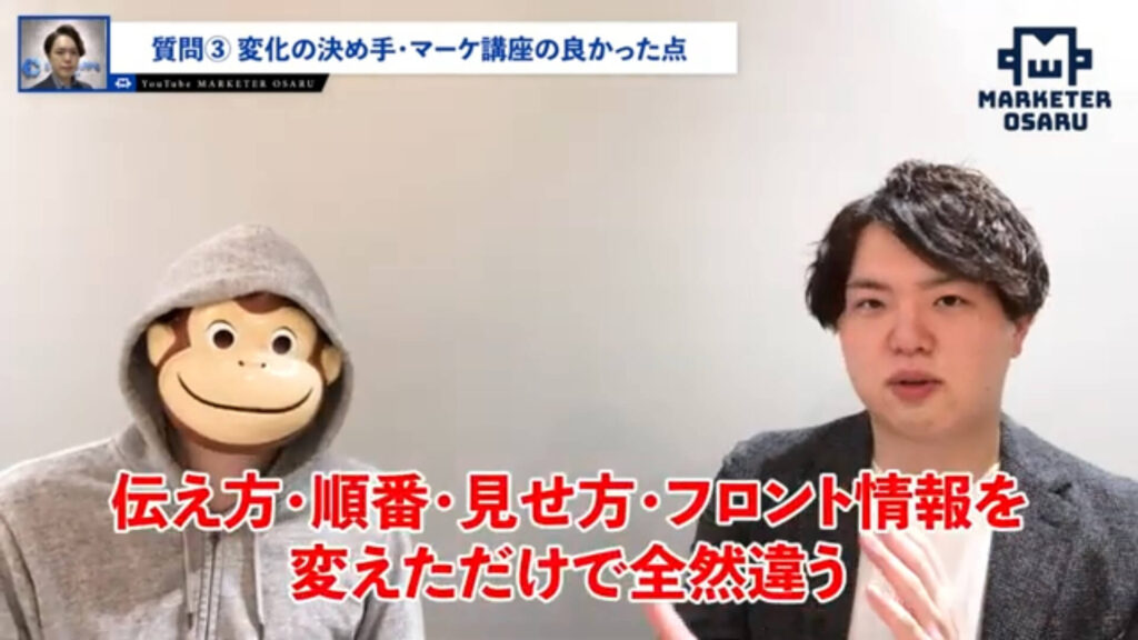 おさる:これはすごく勉強になります。こういった感じでサポートをして、成果を出させて、また受講性の実績が出て。高い商品は売れないだろうと思うかもしれないですが、口コミがあって価値が良ければ売れます。