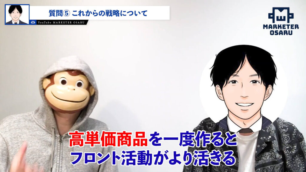おさる:それは素晴らしいですね。フロントの商品や活動があれば、より多くの人に価値を届けられますし、結果的に高単価商品にもつながりますから。