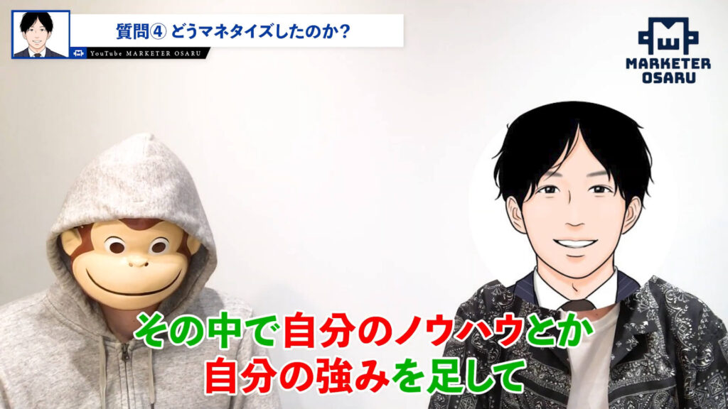 おでん:はい。高単価のXマーケティング講座を販売する形でマネタイズしました。商品設計は、おさるさんの講座で学んだYouTube×X×マーケティングの内容から、YouTubeを除いた形に絞りました。つまり、Xとマーケティングに特化し、自分のノウハウと強みを組み合わせて商品を作り上げたんです。