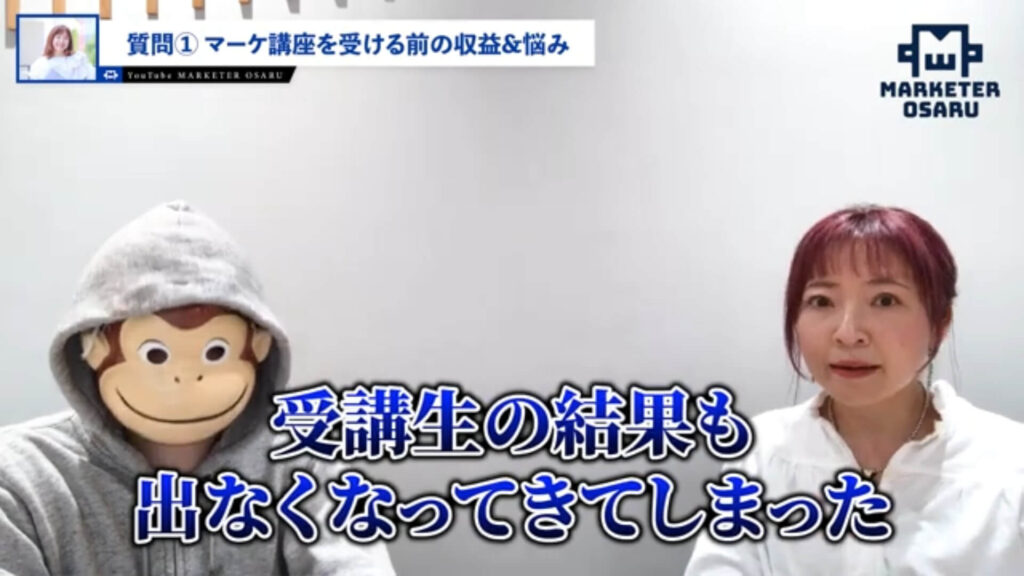 おさる:早速ですが質問を聞いていこうかなと思うんですけれども僕のマーケティングの講座を受ける前の収益と購入前の悩みについて教えていただいてもいいでしょうか。