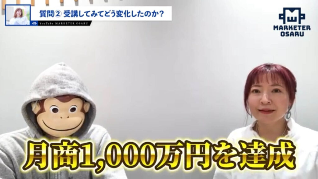 おさる:質問の2つ目なんですけど受講してみてどう変化したのかっていうところで売上げの部分と解決したところについて教えていただいてもいいでしょうか。