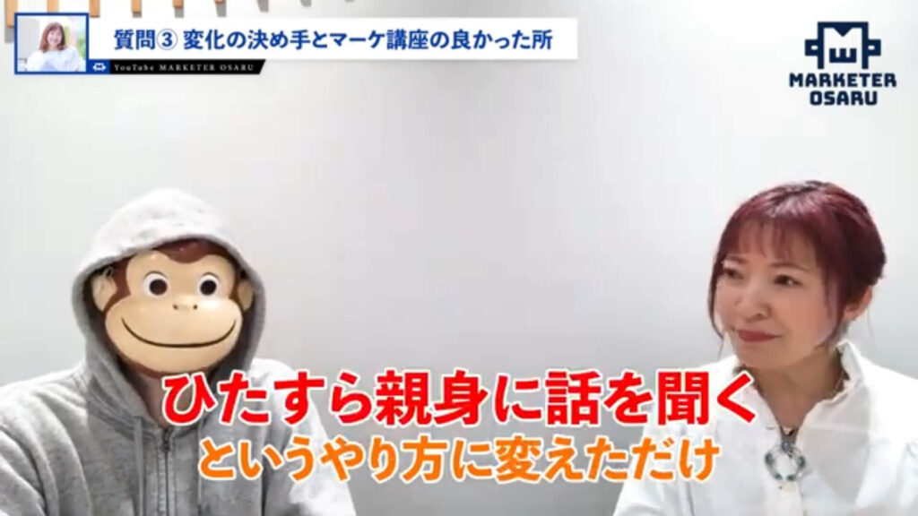 おさる:売上げがなんでこんなに変わったのかと僕のマーケティングの講座の何が良かったのかっていうところで。