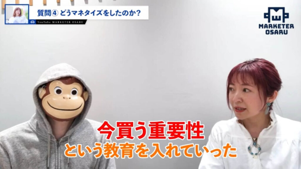 おさる:質問4つ目にいきます。どうマネタイズしたのかというところで多くの女性もこの動画を見ていると思います。参考になる話が聞けると思うんですが販売導線とかその辺りについて教えていただいてもいいでしょうか。