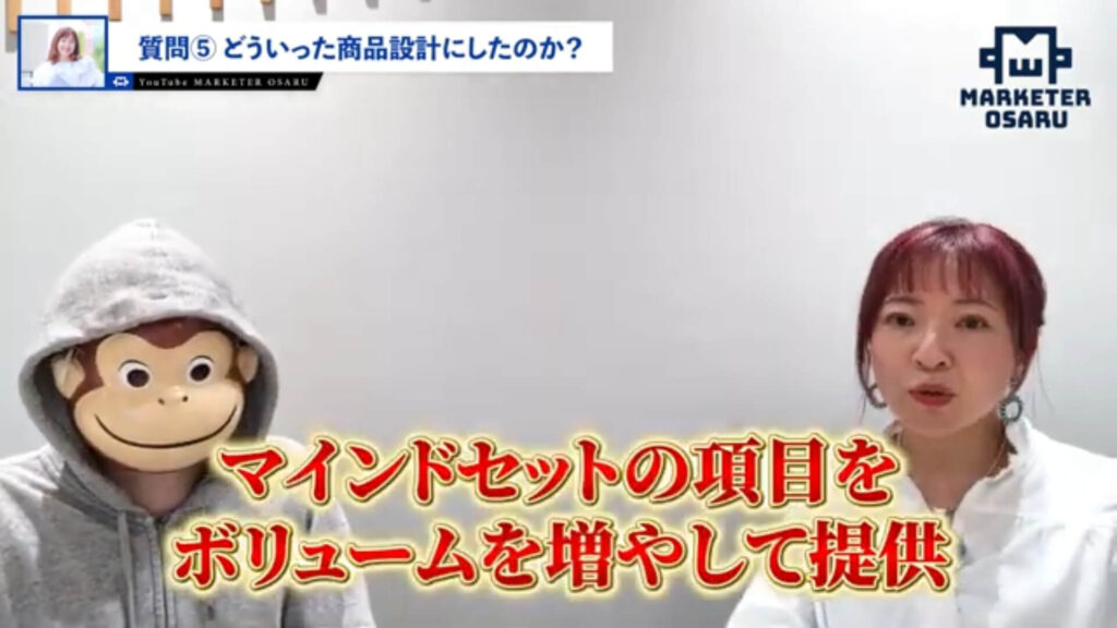 あさみ:もともと私がマーケティング講師だったのもありマーケティングのフレームワークとかノウハウが多かったんですけれど、おさるさんから学んだところで私はマインドセットのところが大きかったのでマインドセットの項目をボリュームを増やして提供をしました。