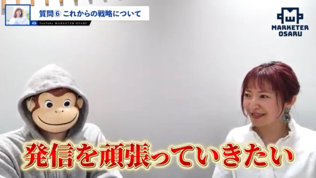あさみ:今まで広告とかなんとなく長くやってきたのでリストはFacebookとかから取れていたんですけど圧倒的に数が足りないっていうことを認識しておりまして、おさるさんのところに入ったからにはYouTubeを頑張らないとなと思っています。
