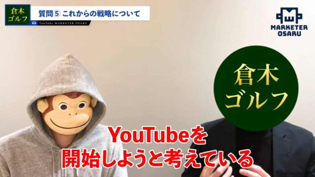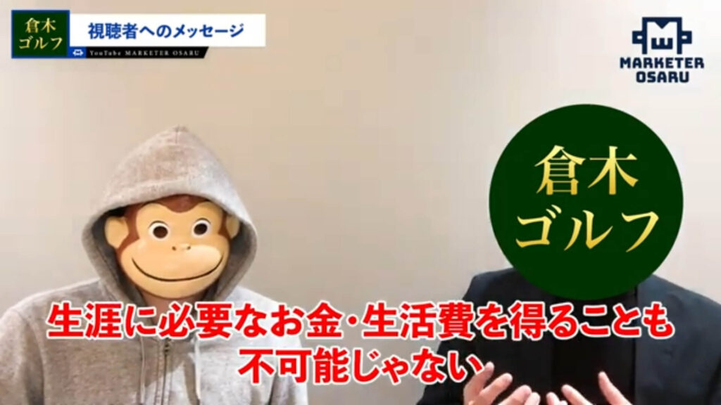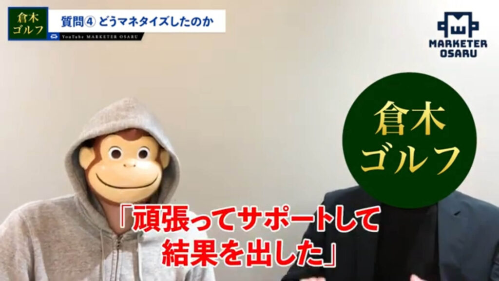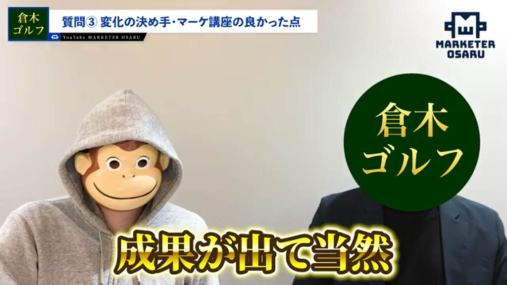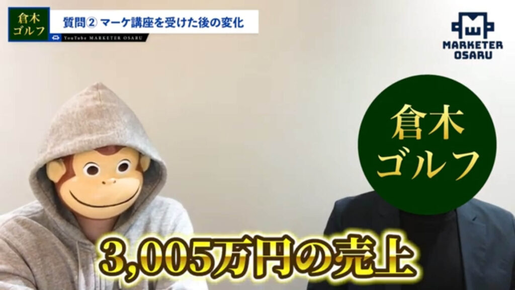 おさる:ゴルフを指導しているとのことで、ゴルフの教材販売は低単価もされたことがあって、今回初めて高単価のおさるモデルに変えたんですね。なぜ「おさるモデル」に感銘を受けたのかも聞いていこうかと思っています。