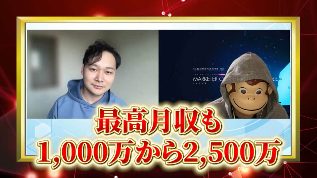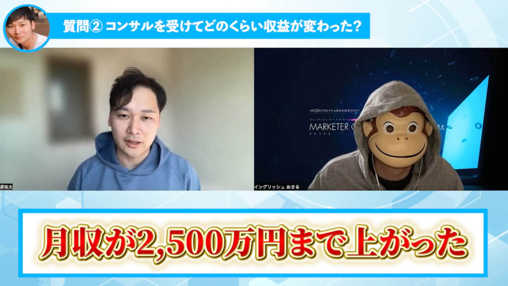 おさる:良かったです。本当、収益も2倍以上になって、最高月収も1,000万から2,500万ってことですけども、やはり当たり前ですけども価値提供した分返ってくるってのが基本原則ですから。