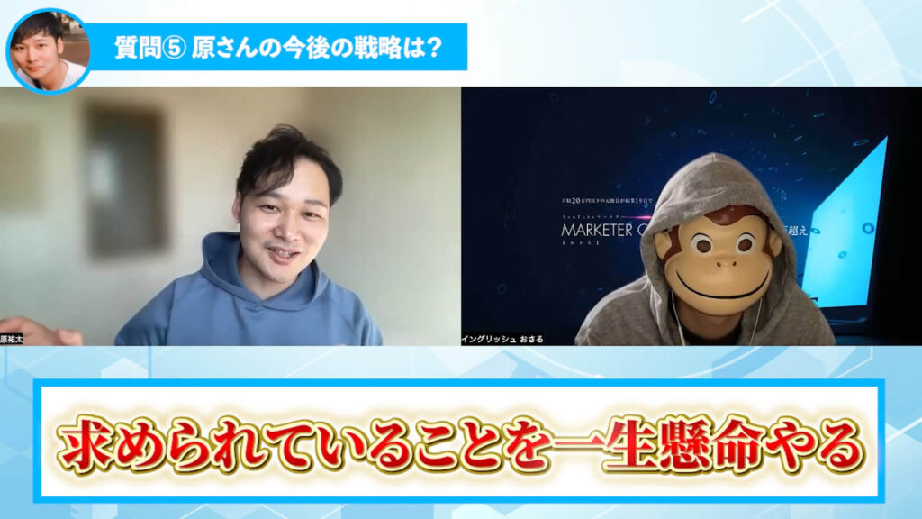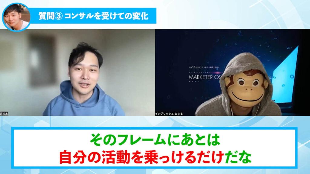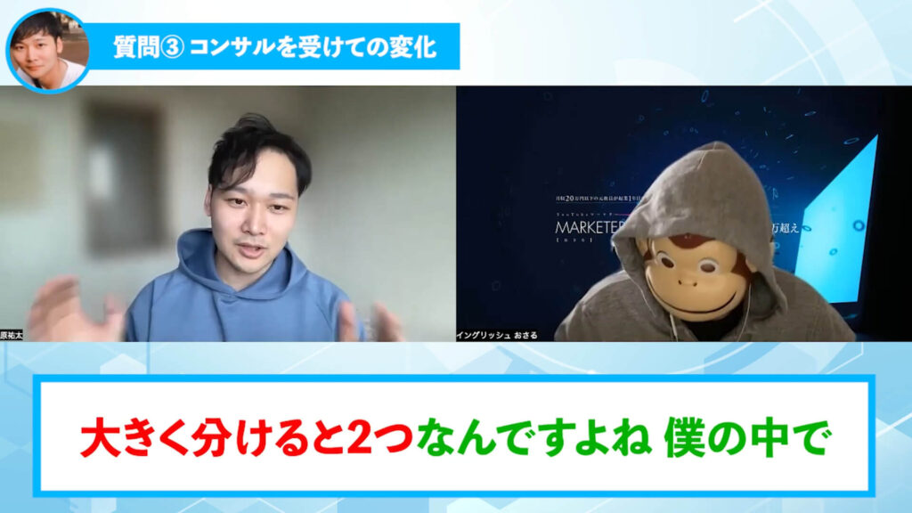 はら:そうですね。おさるさんのコンサルを受けてめちゃくちゃ良かったのが、大きく分けると2つなんですよね、僕の中で。1つ目が、方向性がもうめちゃくちゃ確立されたっていうところで、2つ目がもうやるしかないっていう環境にあったんですよね。