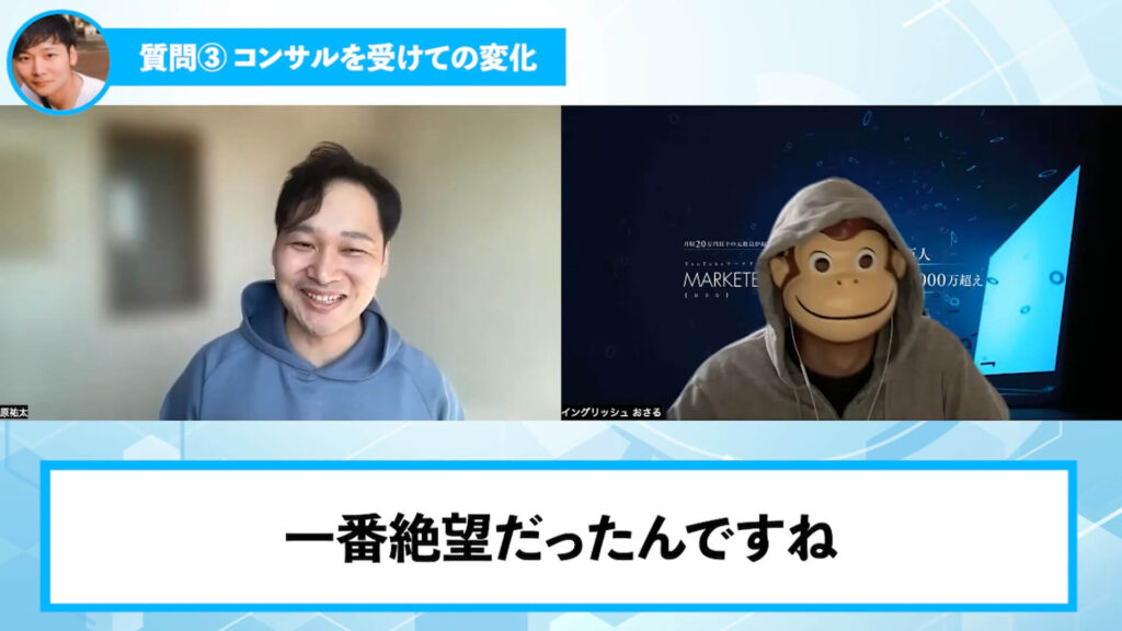 はら:絶望したんですけど、上の人がそういうにやってるっていうのが分かれば、そこに合わせていけば結果が出るよねっていうのが理解できたのが、僕はおさるさんのコンサルで一番良かったところですね。