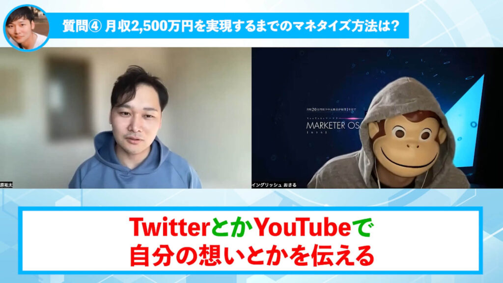 サムネとか台本の作り方でしたり、YouTubeの概要欄の生かし方だとか、プレゼントの作り方っていうところも、もうおさるさんのこれまでのめちゃくちゃ研究されてる内容っていうのを丸出しにしていただいた。
