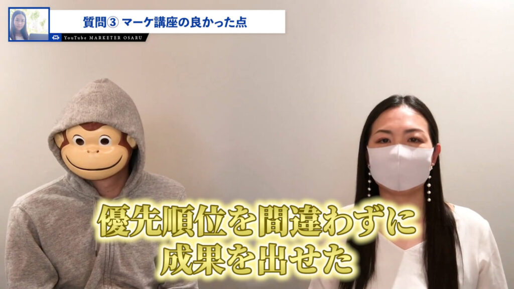 おさる:次に僕のマーケ講座の何が良かったのか、良いところも悪いところも含めて教えてください。はっぴーさんって上級者ですので、講座に対する期待値とかもほかの人よりは高いと思うんですよ。つまり、普通の講座では満足できないですけど、それでも何が良かったのかみたいな。