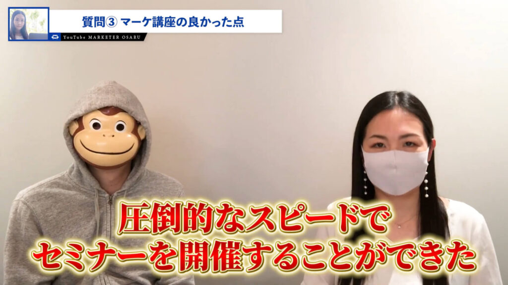 おさる:当たり前ですけれど、成果を出してもらうためには行動してもらわないといけないので、行動してくれない方が来ちゃうと商品が良くても商品が悪いと思われてしまうというのは、本当に共感できますね。しかしセミナーへのマインドブロックも外れたということで。