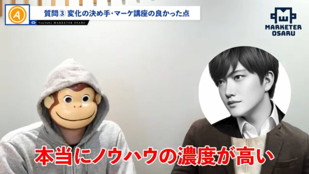 おさる:素晴らしいですね。対談動画を撮って実績をしっかりと出していって、コンテンツの質の高さもきちんと出してどんどん健全化していきたいんですね。こういうふうに受講生の成果もそうですし、いい情報を発信していただければと思います。