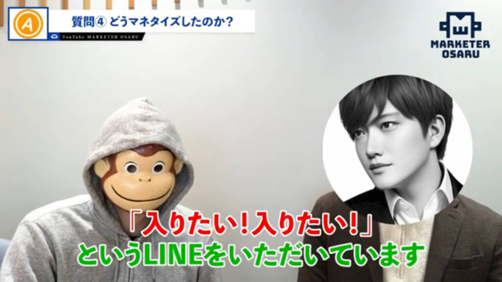 おさる:どうマネタイズしたのかを聞きたいのですが、ノウハウのスクールですね。皆さんいつもシンプルすぎてあまり話すほどではないんですが、YouTubeから集客してまずどこに集客されていますか?