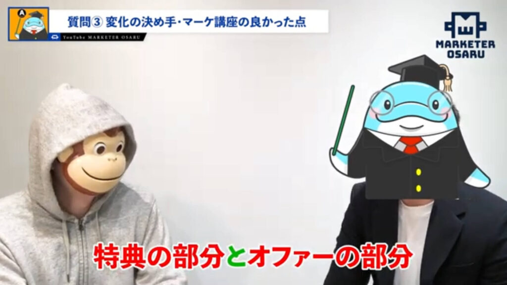 おさる:なるほどですね。物販のプレイヤーとして教えていたことをスクールで教えていると。YouTubeも始めて情報発信をしてというところですよね。質問に入る前に、僕の講座って何で購入しようと思ったんですか?