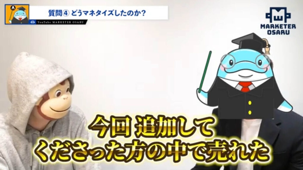 おさる:そこで重大発表で、ちょっとは入っていたけども、新しいプリプリローンチの動画を上げて、500名が登録してくれたと。その500名で2,300万円。過去のリストの人からも売れたりはしたんですか?