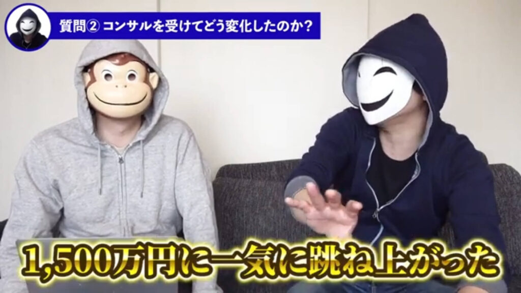 仮メンタリストえる:そうです。そこでちょっとおかしいなと思って話を聞いてそこから改善をしたときに今度は個別のコンサルティング、ちゃんと自分が関わってあげることが大事というのは自分も実感としてあったので、それをお聞きして取り入れてからは1,500万円に一気に跳ね上がりました。
