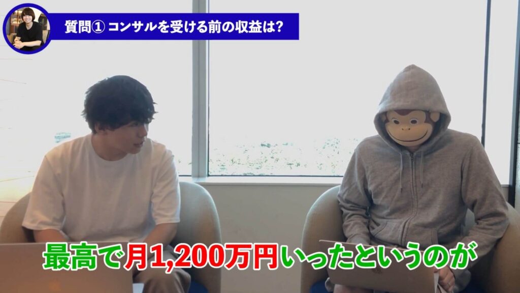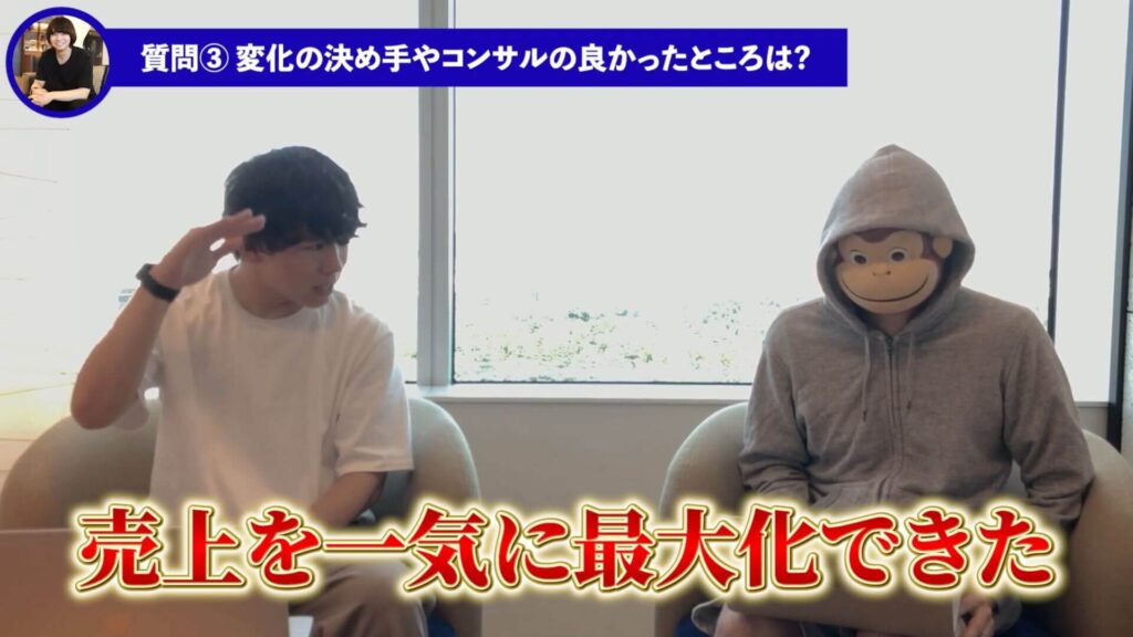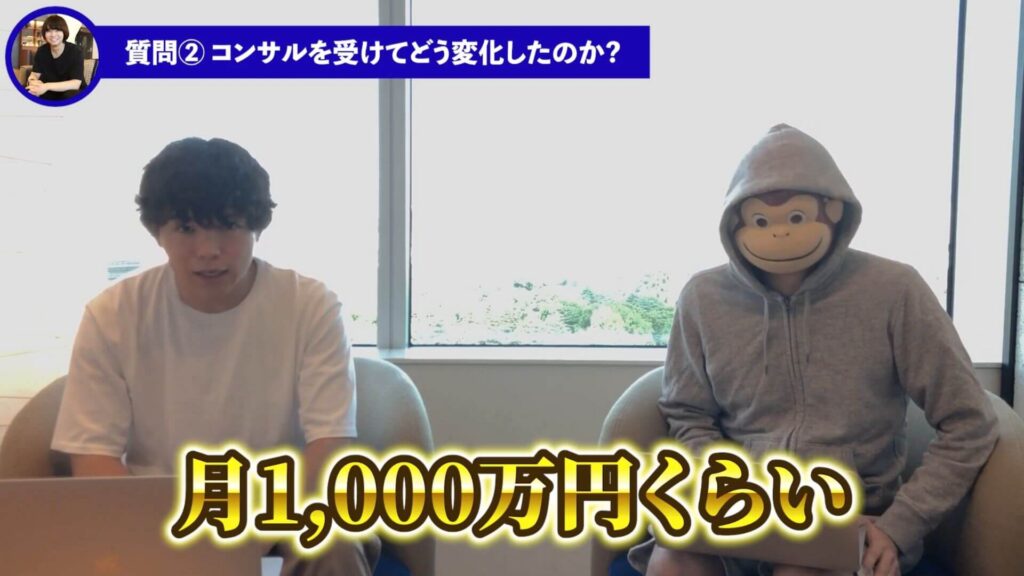 おさる:質問1個目で、先ほどちょっとお話しましたけども、コンサルを受ける前はどれくらいの収益だったのか教えていただいてもいいでしょうか。