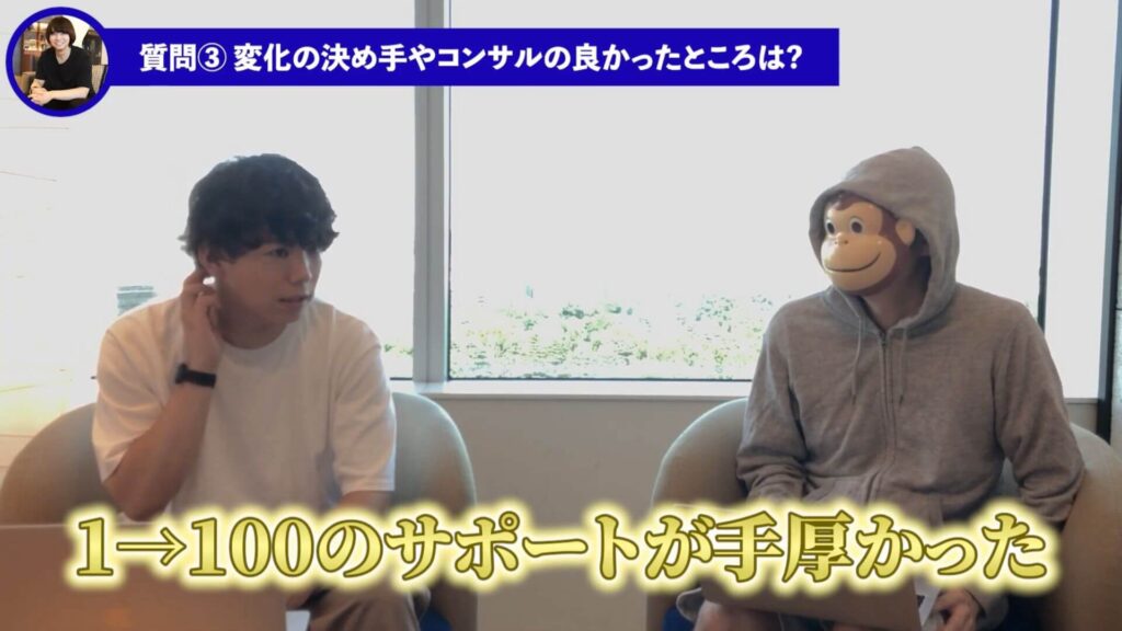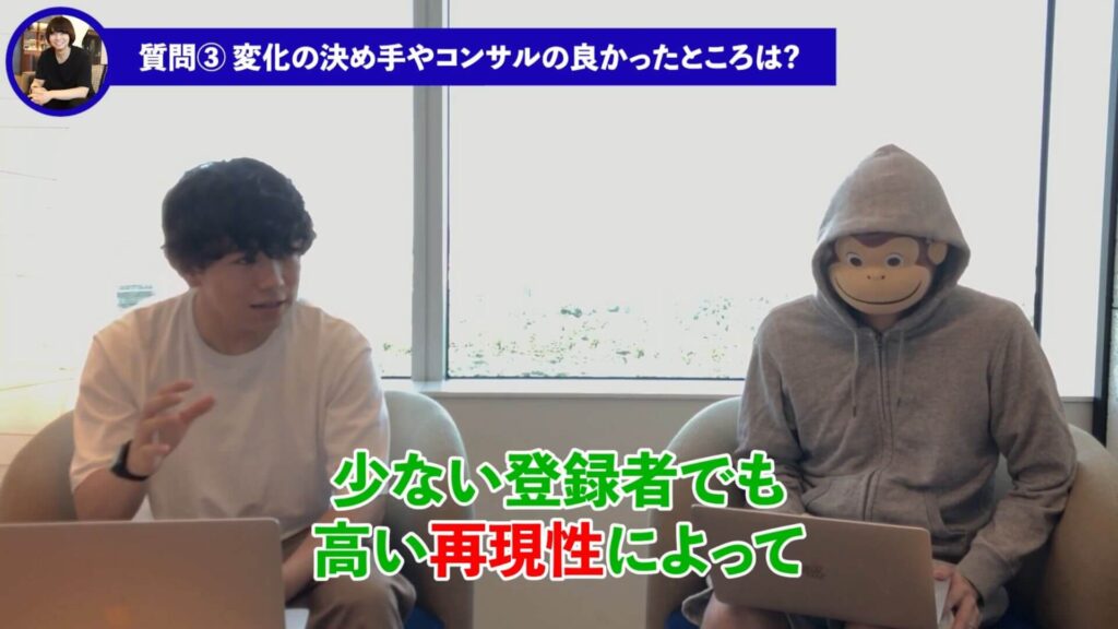 おさる:ここの売上と重なるところもあると思うんですけど、質問3つ目です。その変化の決め手となったもの。リストマーティングという言葉が出てきましたけども、実際に僕のコンサルのどの辺が良かったのかも教えていただいていいでしょうか。